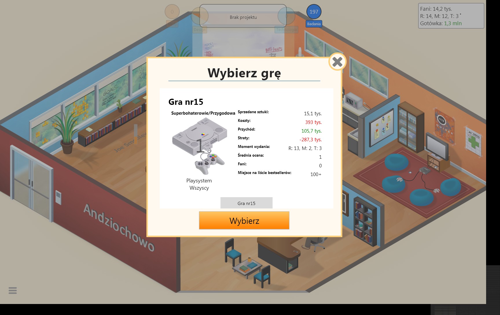 'Game Dev Tycoon’ jest podzielona na kilka etapów. W tym pierwszym tworzymy nasze pierwsze gry, wybieramy temat przewodni (np. polityka, komedia, wyścig), gatunek (RPG, strategia, przygodowa etc). Istotną sprawą jest też wybór platfomy docelowej, może być to po prostu PC, a może być to również produkcja konsolowa. Istotnym elementem jest też wybór grafiki – tekstowa, a może droższa grafika 2D V1? I tym sposobem rozpoczęliśmy naszą przygodę. Kolejnym zadaniem jest wybranie priorytetu pośród trzech kategorii: silnik, rozgrywka, opowieść i zadania poboczne. Przeciągamy suwaki i zaznaczamy, na który z tych elemetów kładziemy największy nacisk.
