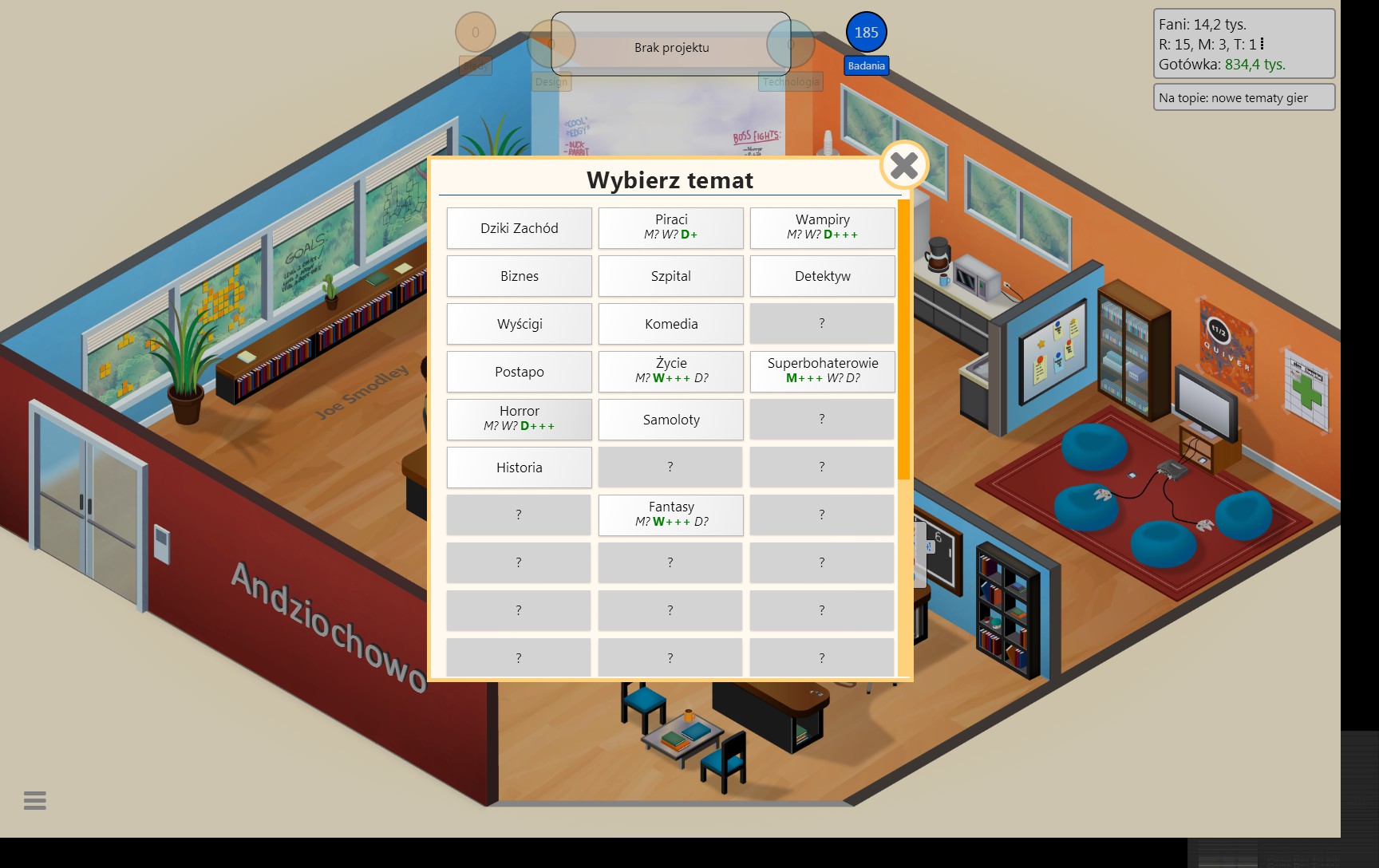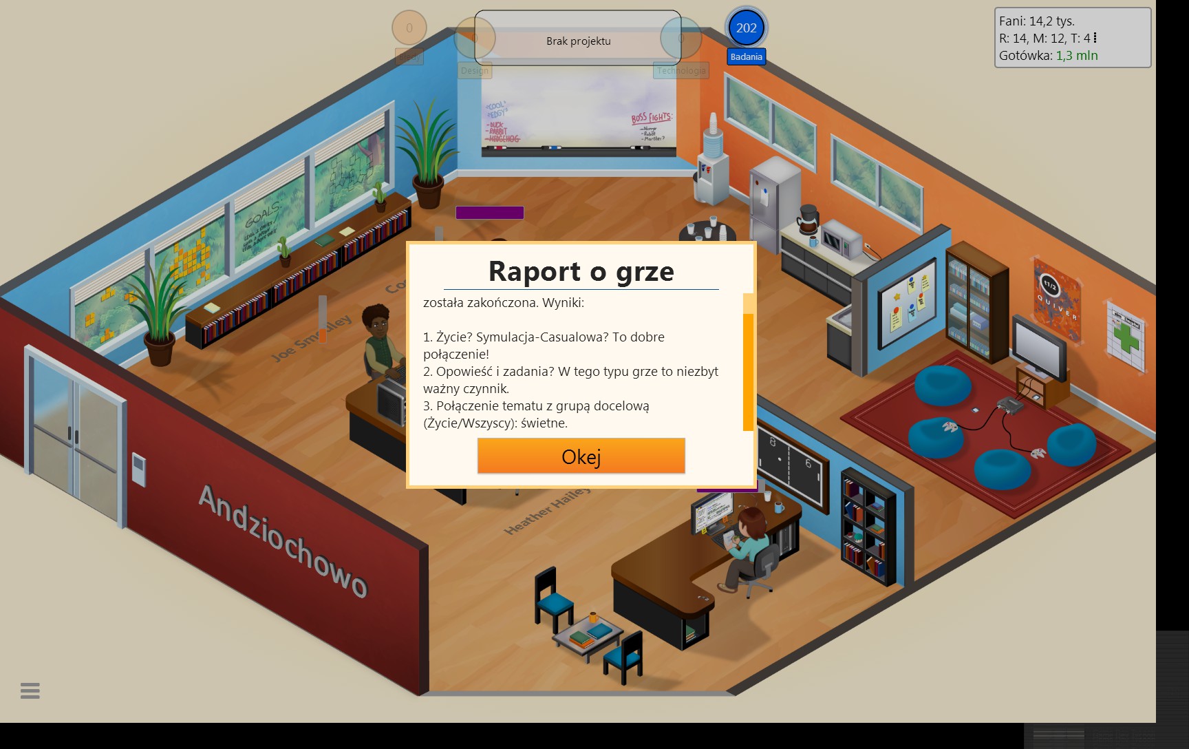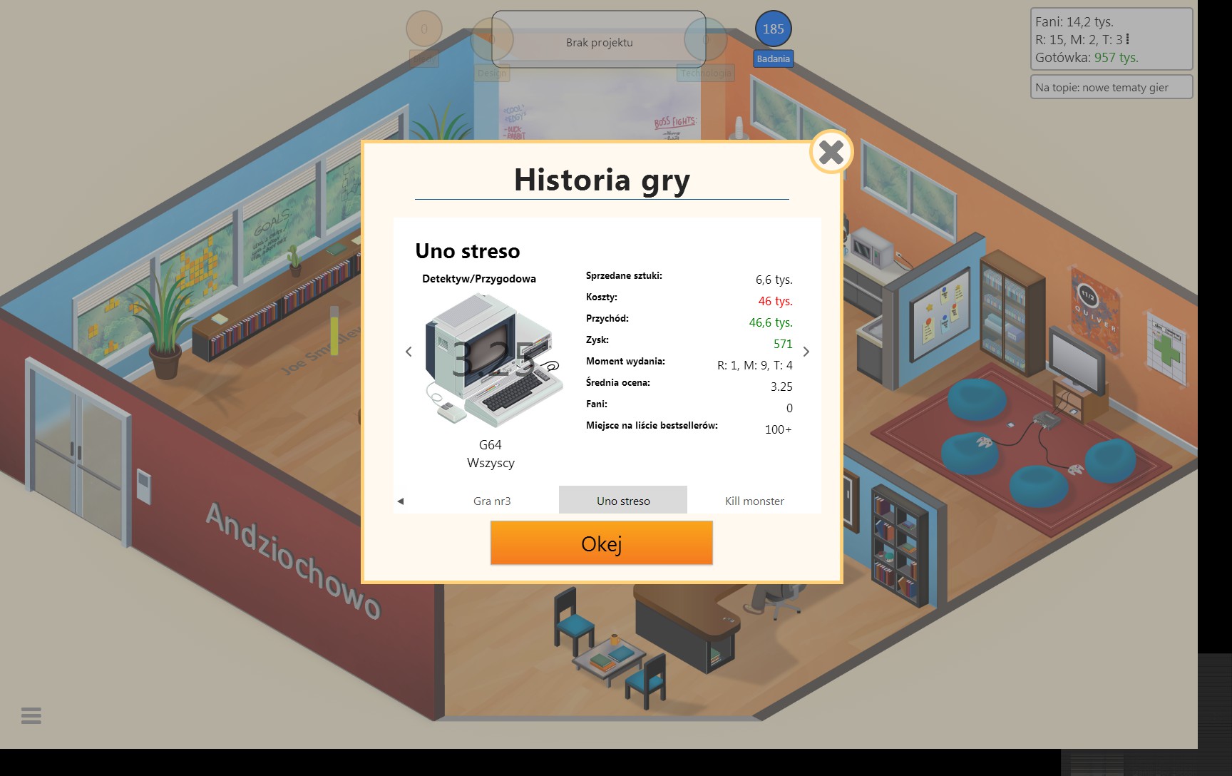 Czasami początki bywają ciężkie, a sam tytuł trudny – zdarza się, iż bankrutujemy, ciężko stworzyć nam dobrą produkcję, nie mamy za co opłacać comiesięcznych rachunków i trach.. zaczynamy od nowa. Tak na prawdę to loteria szczęścia, rosyjska ruletka. Zauważyłam jednak, że można tworzyć popularne na obecnym rynku tematyki i rodzaje gier i zarabiać na tym kasę. Choć regułą to nie jest. Ważnym elementem tej gry jest logika, myślenie i umiejętność wyciągania wniosków. A to wcale nie jest takie proste, jak mogłoby się wydawać 😉 Więc kiedy nam się nie udaje i kończy się cierpliwość to wciskamy ESC i do gry długo nie wracamy. Trochę zawiódł mnie też fakt, że nasi pracownicy są tak mało wymagający; nie strajkują, nie krzyczą o podwyżki, o to że mają za dużo pracy, nie zdradzają naszych planów konkurencji. Pełna profeska i lojalność! Zabrakło mi intryg, dodatkowych problemów pobocznych (tak jak np. w Simcity powódź, albo trąba powietrzna, brak prądu… wiem, trochę na hardkorze, ale fajnie by było…). Więcej zastrzeżeń nie mam i polecam miłośnikom wszelkich tycoonów, którzy chcą oderwać się od rzeczywistości, a i być może spełnić marzenia o sławie i karierze w branży growej ;).