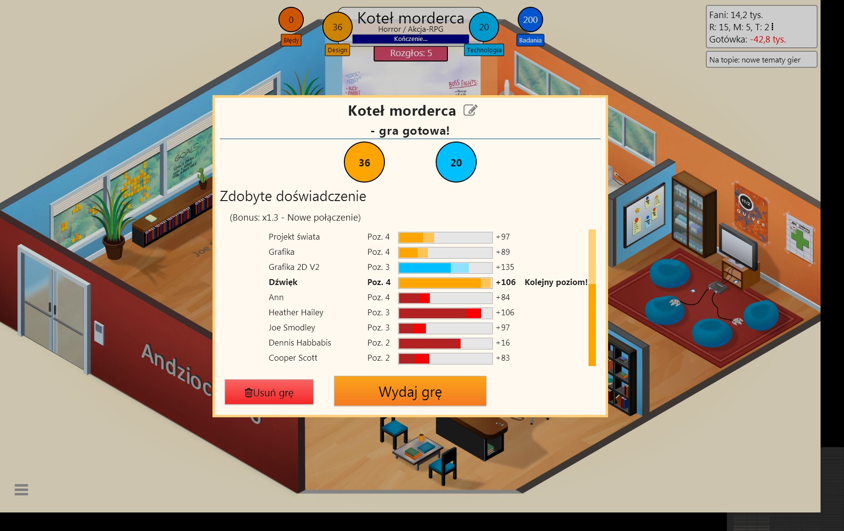 Jeśli są przychylne, a nasza produkcja okazuje się bestsellerem, sprzedanym w milionowym nakładzie to ewoluujemy! Przenosimy się do wypasionego biura, zatrudniamy dodatkowych pracowników, aby łatwiej i szybciej pracować nad kolejnym hitem. Jednakże nie wszystko jest takie proste i cukierkowe. Nasi pracownicy, nad którymi ciąży klątwa sukcesu, tyrający w pocie czoła – bardzo szybko się przemęczają, a ich praca przestaje być efektywna. Popełniają błędy, które trzeba po nich poprawiać. Ach, jakże to życiowe, chciałoby się rzec. I co wtedy? Co z takim zrobić? Ano wysłać go na urlop, gdzie zregeneruje siły i wróci ze zdwojonym zapałem, żeby zdominować rynek gier!