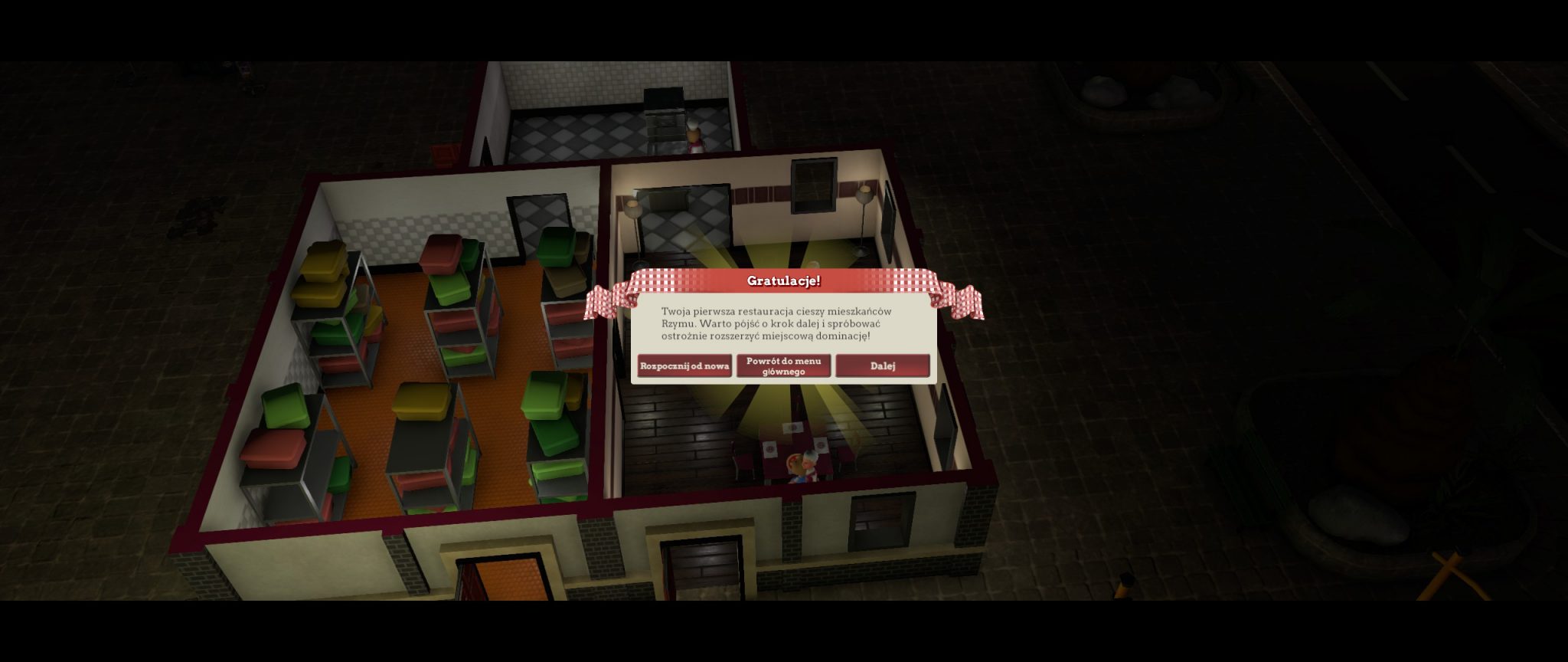 Graficznie widać różnicę między Pizzą Connection 3, a jej poprzednimi częściami, najnowsza odsłona jako pierwsza została wykonana w pełnym trójwymiarze. Są ludzie, których szata graficzna nie zachwyca, bo rzeczywiście daleko jej do tego, co pokazują nowe gry. Jednak mi to niespecjalnie przeszkadza, tycoony mają mnie bawić i oferować pełną wyzwań rozgrywkę, a nie doznania wizualne. Patrząc na grę, mam wrażenie jakbym cofnęła się kilka lat wstecz, myślę więcej o wcześniejszych częściach, wspominam, porównuję. Może taki był zamysł twórców, żeby zaczerpnąć coś ze starszych wersji i przywołać w graczu nostalgię?
